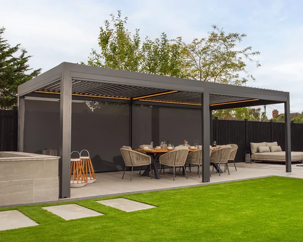 Create a stylish and comfortable extension of your home with adjustable louvred roof panels and integrated LED lighting. Control sunlight, airflow, and ambience effortlessly for day-to-night enjoyment in every season.