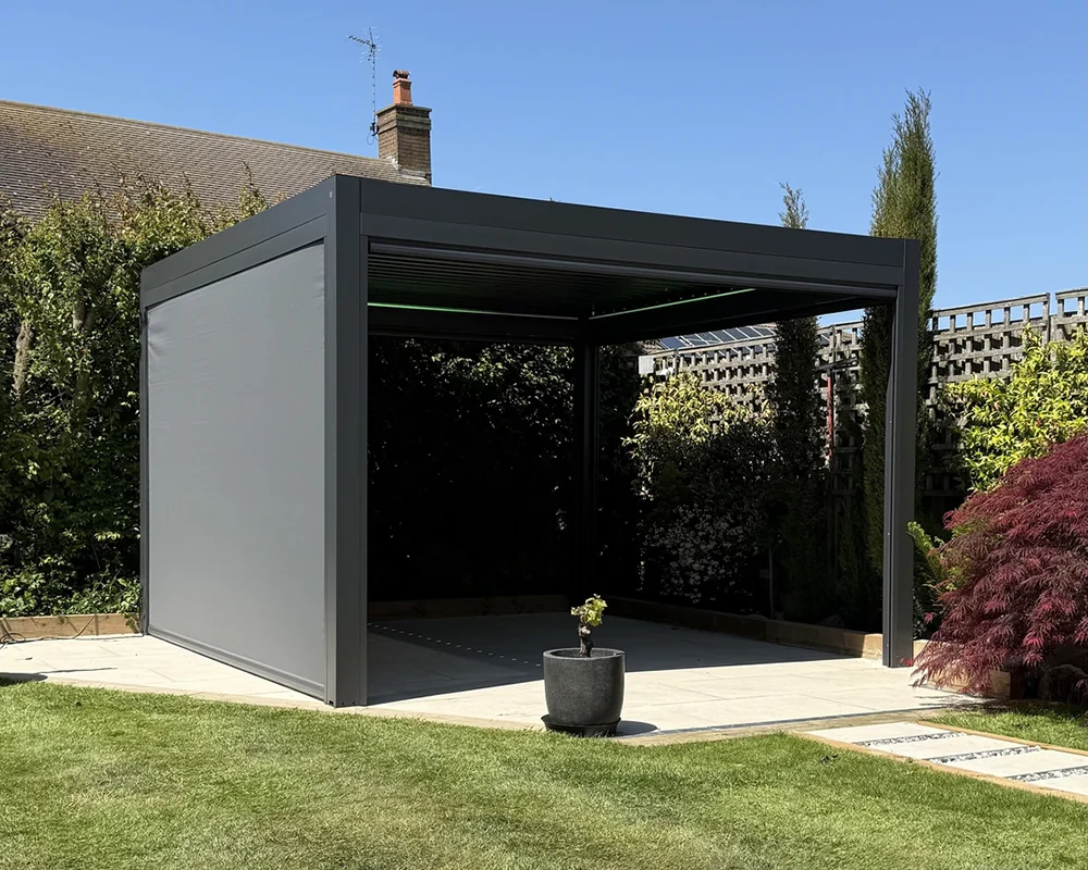Crafted from industrial-grade, powder-coated aluminium, this electric pergola system can be tailored to suit your layout and dimensions. From standard rectangular designs to bespoke L-shaped configurations, it adapts to your space beautifully.